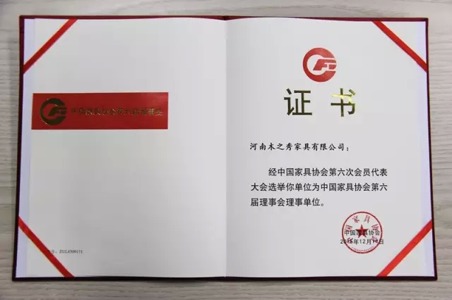 河南木之秀家具有限公司當(dāng)選為中國(guó)家具協(xié)會(huì)第六屆理事會(huì)理事單位